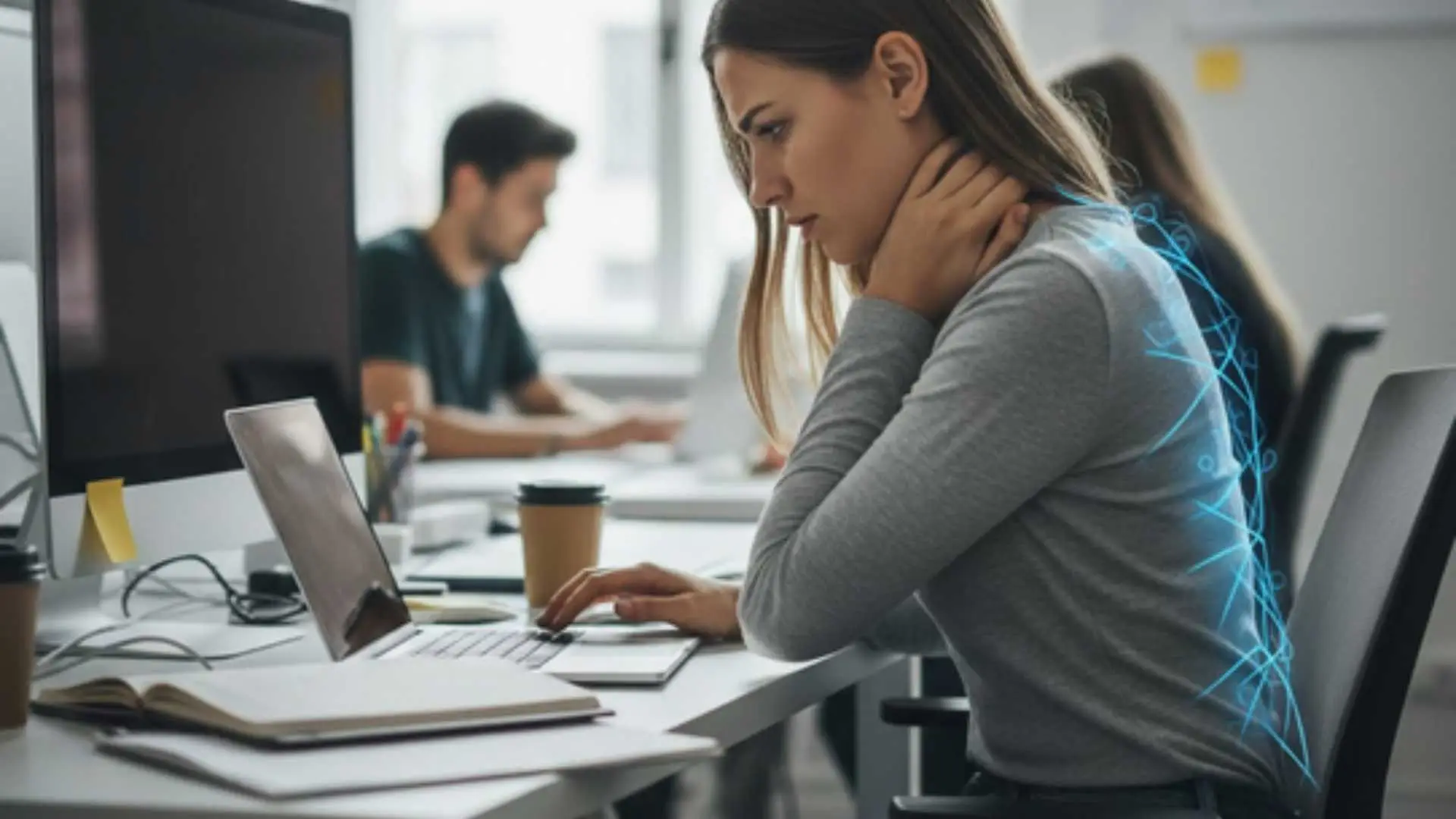 - Écran trop bas : un laptop posé sur une table oblige souvent à fléchir la nuque et à arrondir le haut du dos, ce qui surcharge la région inter-scapulaire.